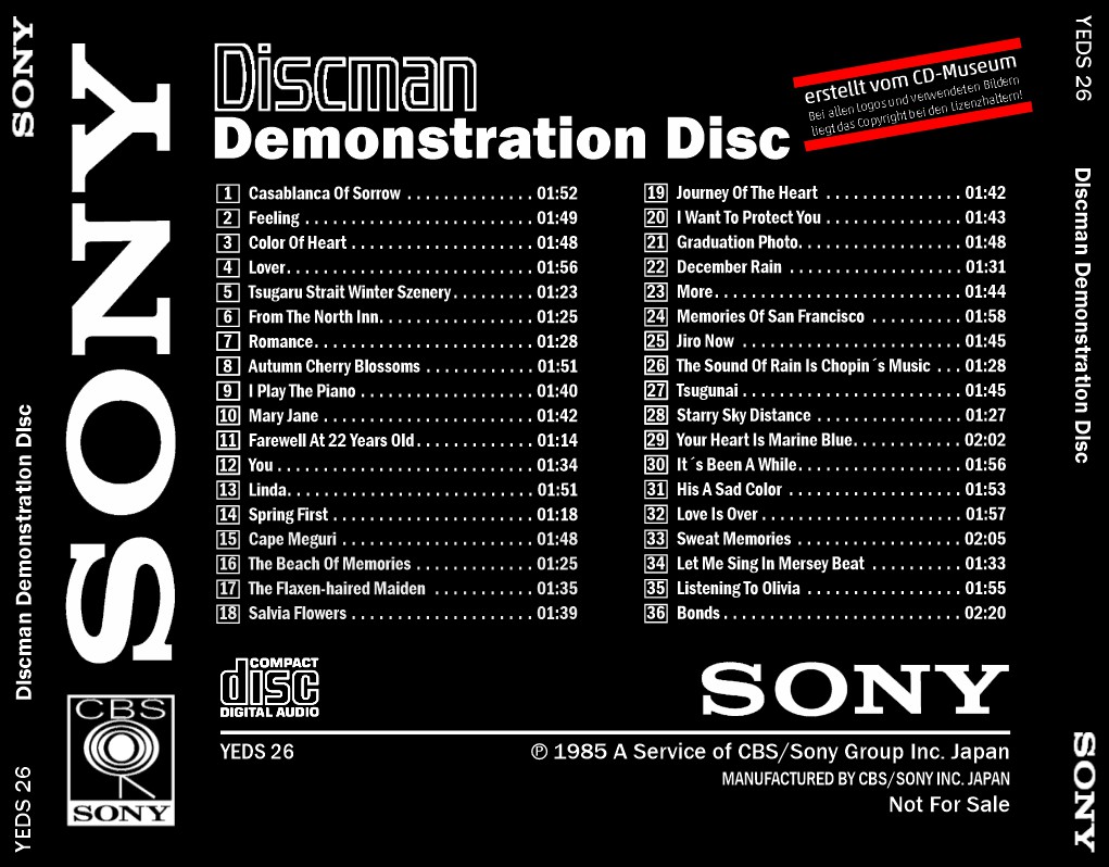 CD Demonstration Disc · YEDS-27 · Japan · © 1986 Sony Corporation / CBS-Sony Group Inc. CD Demonstration Disc · YEDS-27 · Japan · © 1986 Sony Corporation / CBS-Sony Group Inc. CD Demonstration Disc · YEDS-27 · Japan · © 1986 Sony Corporation / CBS-Sony Group Inc. CD Demonstration Disc · YEDS-27 · Japan · © 1986 Sony Corporation / CBS-Sony Group Inc. CD Demonstration Disc · YEDS-27 · Japan · © 1986 Sony Corporation / CBS-Sony Group Inc. CD Demonstration Disc · YEDS-27 · Japan · © 1986 Sony Corporation / CBS-Sony Group Inc. |