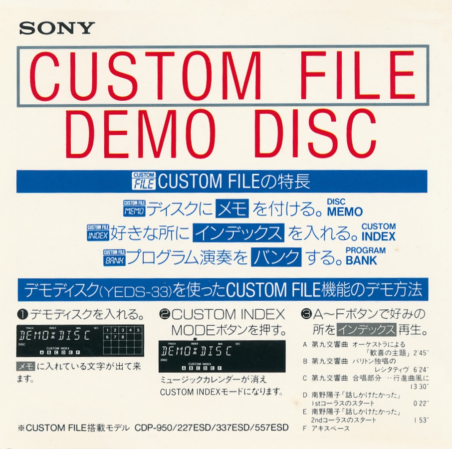 Sony Custom File Demo Disc [YEDS-33 • JP • 1987 • Demo] |